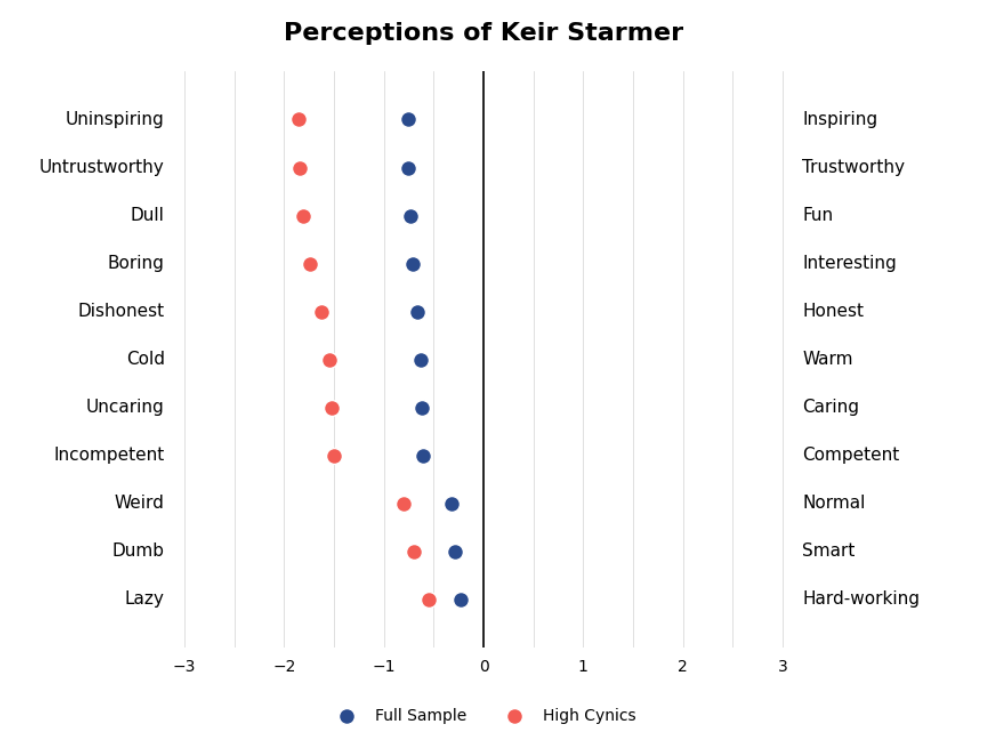 We also asked respondents to rate Starmer on a series of contrasting personality traits — such as “honest” vs. “dishonest”, “inspiring” vs. “uninspiring”, “competent” vs. “incompetent” — using a 7-point scale ranging from –3 (strongly negative) to +3 (strongly positive). The chart below shows the average rating for each pair, comparing the full sample with highly cynical voters. While the general public already leans negative, highly cynical voters are far more likely to see Starmer as untrustworthy, dishonest, uncaring, and incompetent.