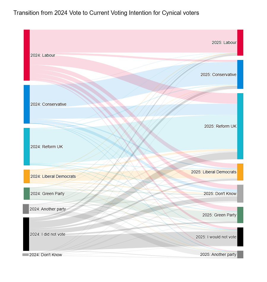 This dynamic is more clearly visualised in the chart below, which tracks how cynical voters have moved since the 2024 election: