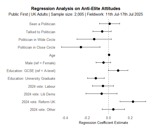 When we run a regression analysis and control for personal characteristics such as age, gender, education, and 2024 vote choice, only having a politician in one’s close circle remains significantly associated with lower anti-elite attitudes. The analysis also reveals some broader patterns, such as university graduates being less anti-elitist than people with A-levels, and Reform voters being more anti-elitist than Conservative voters.